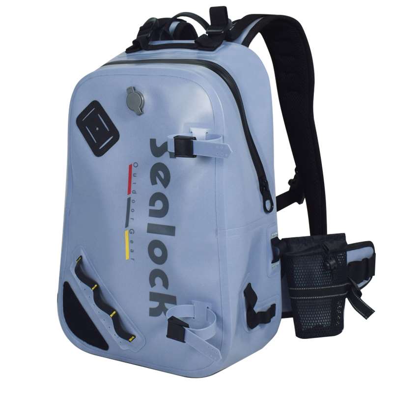 This is a wearable flying fishing backpack. Fly fishing pack 24L waterproof backpack uses TPU840D double-sided lamination material, which is seamless and very strong. It is airtight and increases the tightness of the bag. The backpack reduces the pressure on the shoulder, making it more convenient for you to fly fishing in outdoor streams or wetlands. There is a flying fishing tool suspension system at the front side, and a water bottle storage and storage at the side. The whole package is seamless and equipped with a waterproof zipper with strong vapor tightness, Even if you go to the deep water area, you can keep the bag dry. The internal storage can also store small electronic equipment, etc. The front double-shoulder extended vest can be used separately. The vest accessories have a separate vapor tight small square bag, which can store telephone batteries, etc. The added external system can store knife accessories.